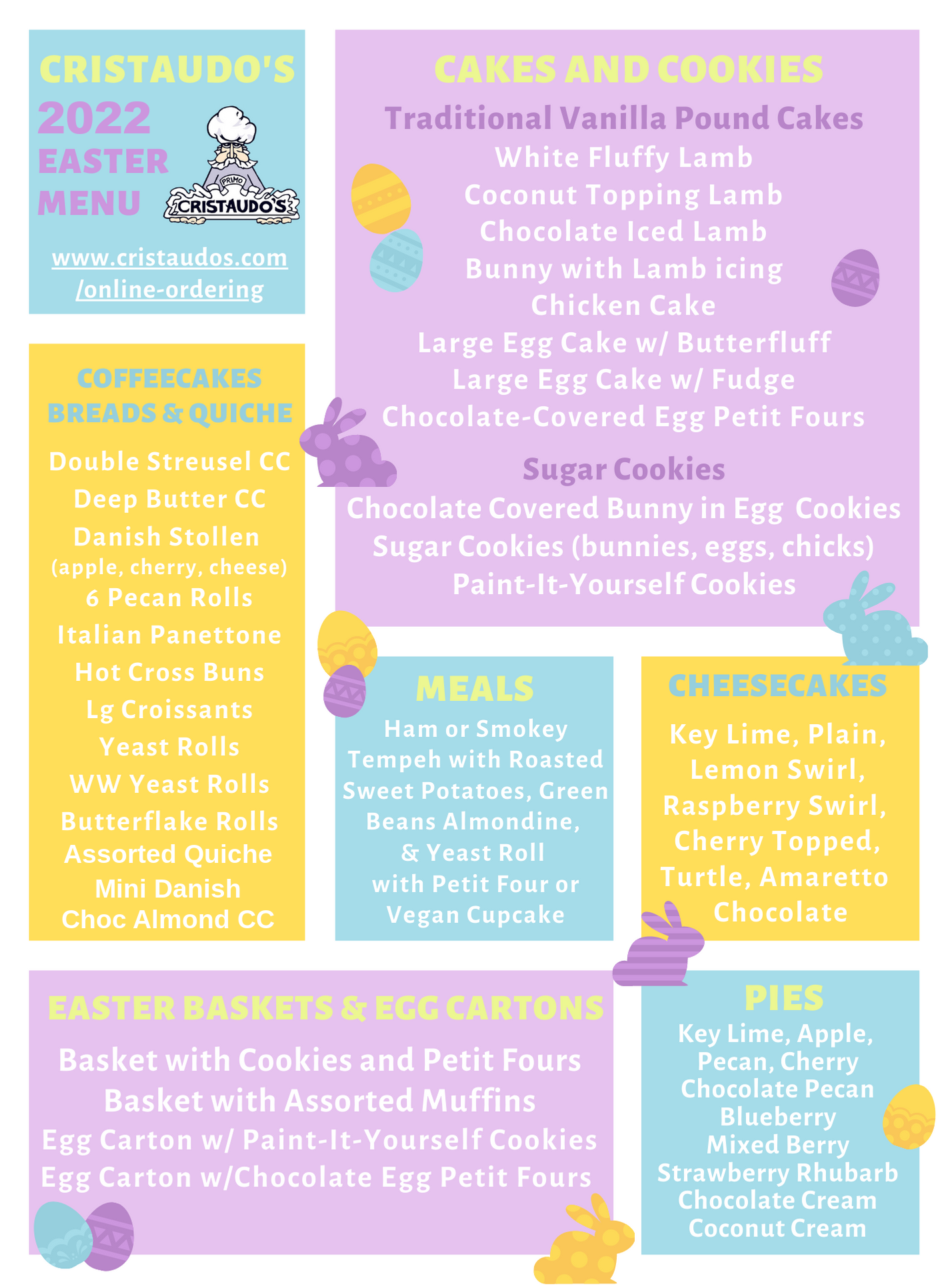 Hop on over to our online ordering page choose from a plethora of Easter Sweets, Treats and Savory Specials!