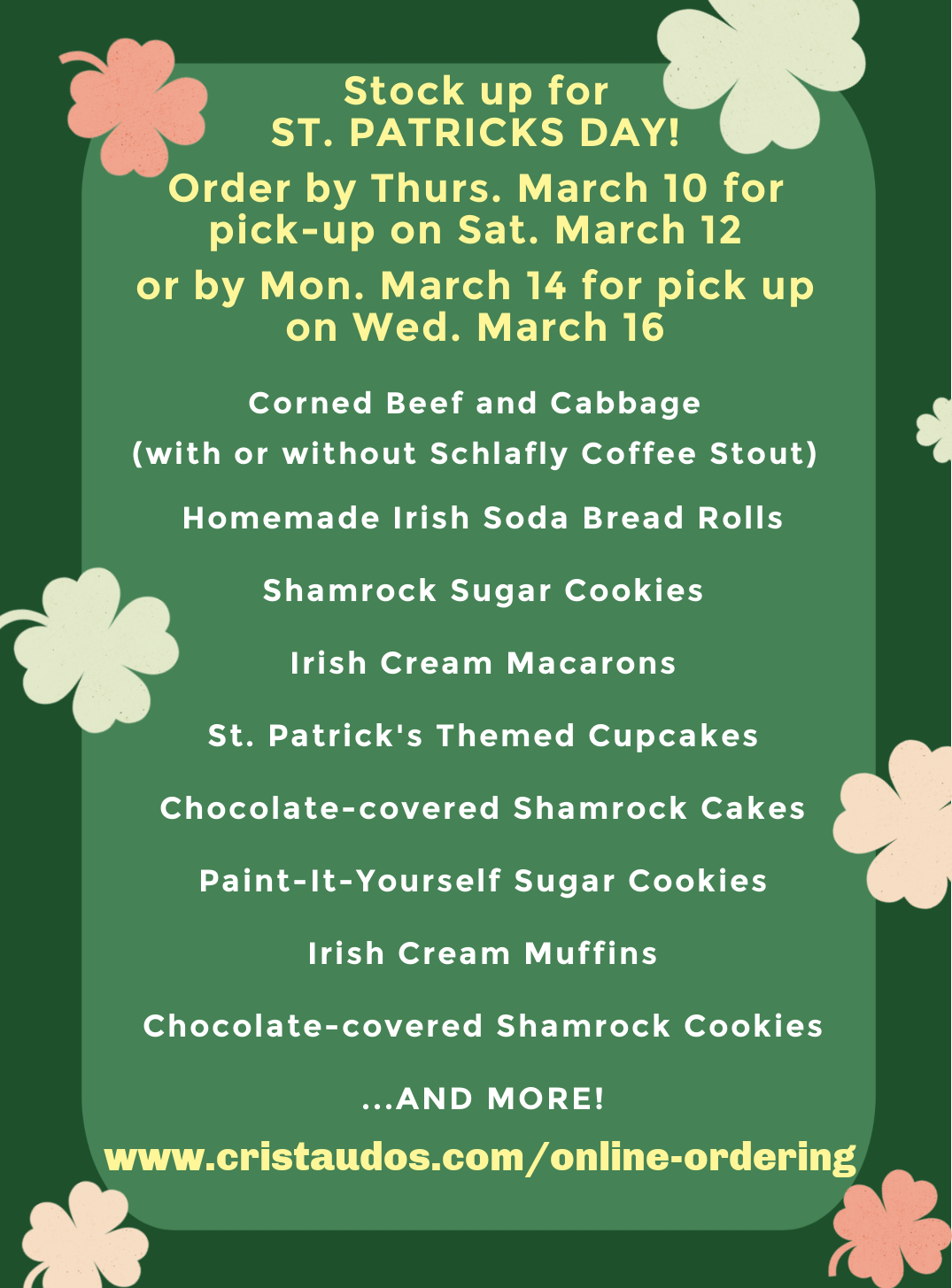 Check our our St. Patrick’s Day offerings, as well as our corned beef and cabbage!